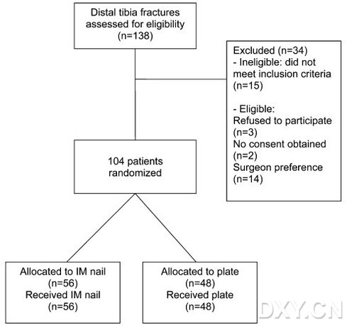對于脛骨遠端骨干骨折而言,其手術治療方式尚存有爭議。髓內釘或鋼板固定在文獻中經常見諸報道。據(jù)以往報道稱,髓內釘固定者術后有膝關節(jié)痛病例出現(xiàn),而鋼板固定有時會增加感染或骨不愈合的風險。因此,兩種固定方式何者更佳就成為一個非常令創(chuàng)傷骨科醫(yī)生感興趣的課題。近日,美國學者Heather A. Vallier, MD等實施了一項前瞻性隨機對照研究,對鋼板和髓內釘固定脛骨干遠端骨折的治療效果進行比較,并在最近一期的JOT雜志上公告了其研究報告。 該研究中共包括104例脛骨遠端關節(jié)外骨折病例,患者的骨骼系統(tǒng)均已經發(fā)育成熟,平均年齡為38歲(范圍,18-95歲),平均損傷嚴重程度評分為13.5 (范圍, 9–50)。多數(shù)病例為高能量損傷。將患者隨機分為擴髓髓內釘組(n = 56)和內側長鋼板組(n = 48)。40例(39%)為開放性骨折。28例(27%)伴有腓骨骨折(腓骨骨折也做固定)。并發(fā)癥評價方式包括畸形愈合,不愈合,感染以及二次手術。