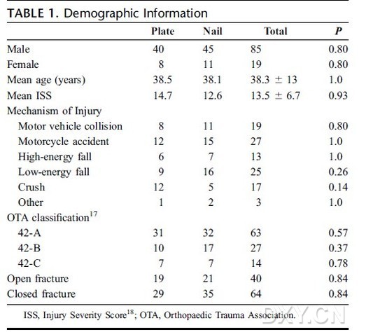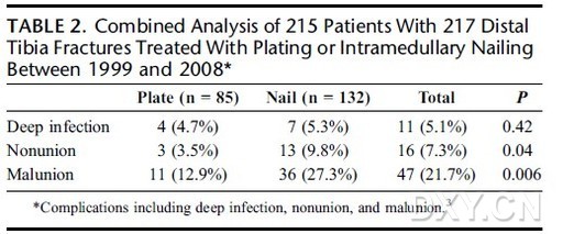表1. 人口統(tǒng)計學數(shù)據(jù) 研究結果顯示,兩組間在年齡,性別,損傷嚴重程度評分,骨折類型,開放骨折的分型等方面均無差別。6例患者(5.8%)出現(xiàn)了深部感染,兩組間病例數(shù)相同。83%的感染發(fā)生于開放性骨折病例中。4例(7.1%)髓內釘固定病例出現(xiàn)了骨不愈合,2例(4.2%)鋼板固定病例存在骨不愈合趨勢(這些病例均存在腓骨遠端骨折,骨折均進行了手術固定)(P = 0.25)。所有骨不愈合病例均發(fā)生在開放性骨折患者中(P = 0.0007);閉合骨折的一期骨折愈合率為100%。≥5°一期成角對線不良病例在髓內釘組有13例(占髓內釘組的23%),而鋼板組為4例(占鋼板組的8.3%)(P = 0.02)。另有6例患者違背醫(yī)囑立即負重后出現(xiàn)對線不良。畸形愈合病例中以外翻畸形最為常見(n = 16)。愈合不良病例中以開放骨折最為常見(55%, P = 0.04)。髓內釘固定組中85%的對線不良患者未進行腓骨骨折固定。鋼板固定組中11例接受了15次再次手術,其中5例取出了內固定物;而髓內釘組中有10例患者接受了14次再次手術,5例取出了內固定物;兩組間無顯著差異。 表2.兩組的并發(fā)癥發(fā)生情況 作者最后得出結論,在脛骨干遠端骨折的手術治療中,非鎖定鋼板和擴髓髓內釘固定均表現(xiàn)出較高的一期愈合率。感染,不愈合,二次手術等并發(fā)癥發(fā)生率在兩組間相似。開放性骨折病例的感染,不愈合以及畸形愈合等并發(fā)癥的發(fā)生率較高。相比鋼板固定,髓內釘固定與術后對線不良的關聯(lián)性更高。腓骨骨折的骨折有利于術中脛骨骨折的復位。腓骨骨折的固定是否影響脛骨的愈合值得進一步研究。該研究人群的經濟評估及功能療效數(shù)據(jù)將有助于創(chuàng)傷骨科醫(yī)生合理地制定治療決策。 |